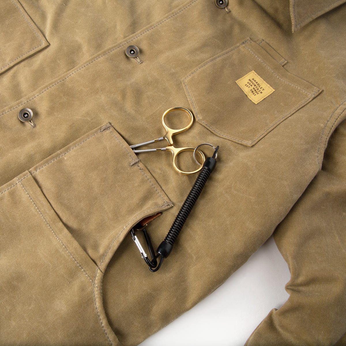 The famous Blanket Lined Cabin Jacket is back for our Fall/Winter collection! This new jacket is lined with 100% USA Milled Wool from Faribault Woolen Mills. It is thick and extremely comfortable. This waxed jacket will protect you from the rain and keep you nice and warm. 12 oz Waxed Canvas Outer 100% USA Made Wool Lining Flannel Lined Sleeves and Pockets Antiqued Brass Button Shanks Antiqued Brass Snaps on Neck Button & Sleeves Fits like a trucker jacket – sits at the belt line Chest Pocket, Pen Slot, Fly Rod Snap, Screws Pockets, D-Ring for Forceps/Tool. Interior Chest Pocket Spot Clean Only USA Made Click here for sizing chart