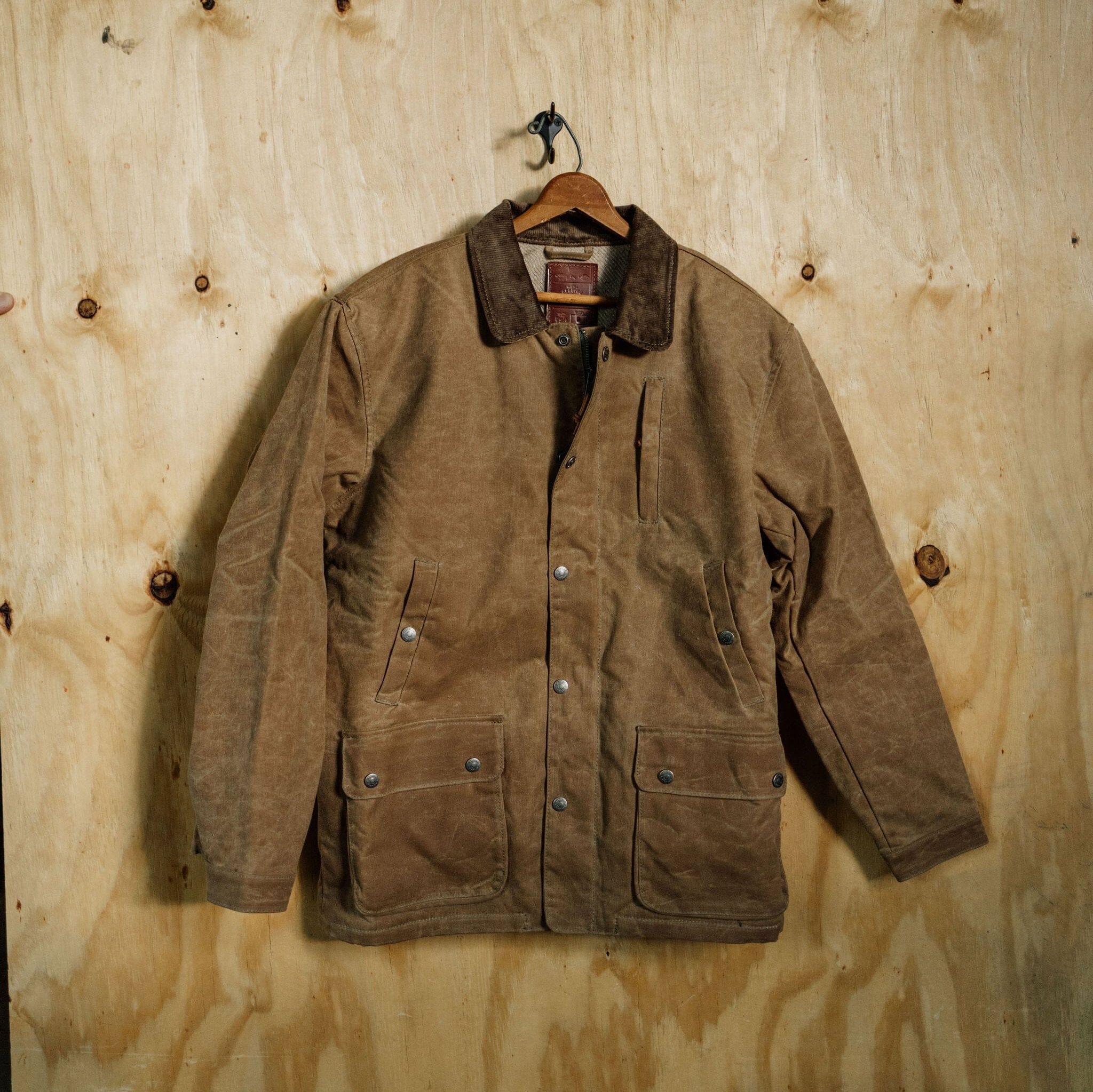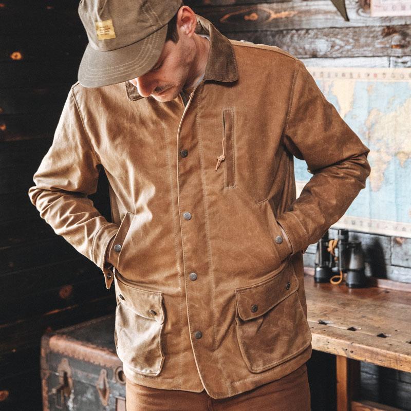 The Field Jacket is our answer for the rancher, the outdoorsman, or the person that just wants to stand out. This jacket gives you everything you need in storage, and function, while looking clean and classic. With its water resistant waxed outer layer, soft 100% wool lining, and multi-function pocket features, you’ll never need another jacket. Made in the USA. 12 oz Waxed Canvas Outer 100% USA Wool Blanket Lining- New Pendleton Wool Antiqued brass snaps Fits like a car coat – a few inches longer than the Cabin and just below the belt line. 2 Gusseted dump pockets 2 Mid height pockets (rifle pockets) Zipper and snap wind flat on front Corduroy collar Zipper chest pocket Interior Pocket Spot Clean Only Made in USA Click here for sizing chart