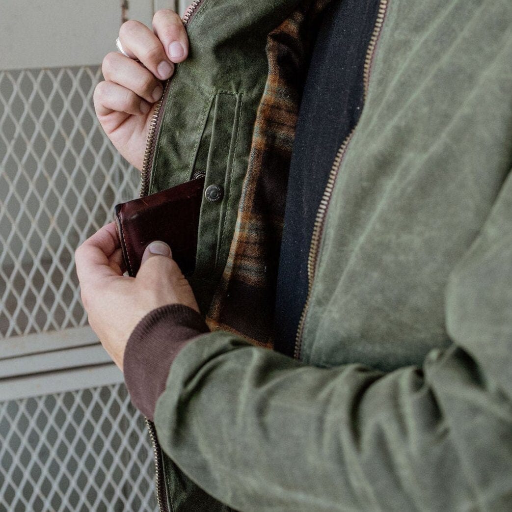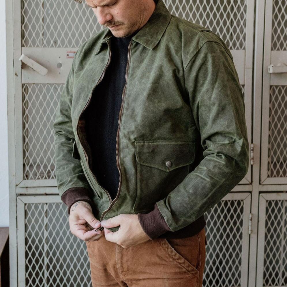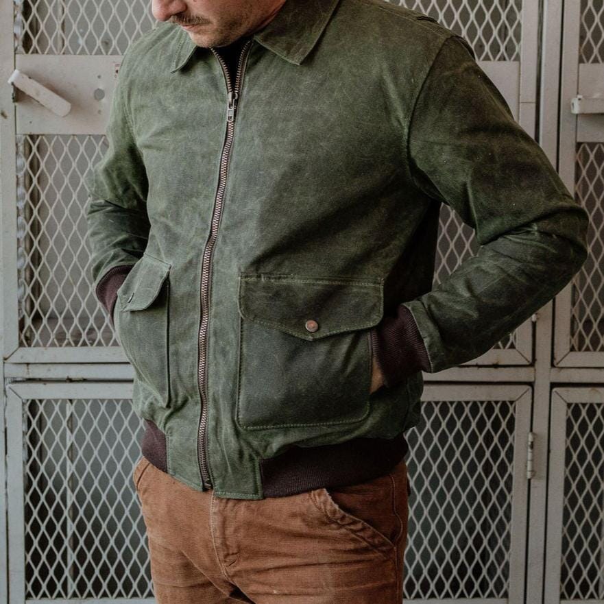 Welcome the newest addition to the Bradley Mountain Jacket line: The G-1 Bomber. Modeled after the 1947 Navy Jacket, we put our own spin on it. With waxed outer, and soft flannel lining, this jacket is an instant classic. 12 oz Waxed Canvas Outer Flannel Lined Sleeves and Pockets Antiqued Brass Button Snaps Gusseted shoulders for mobility. Double entry pockets Chunky front metal zipper Hidden inside pockets Spot Clean Only USA Made Click here for sizing chart