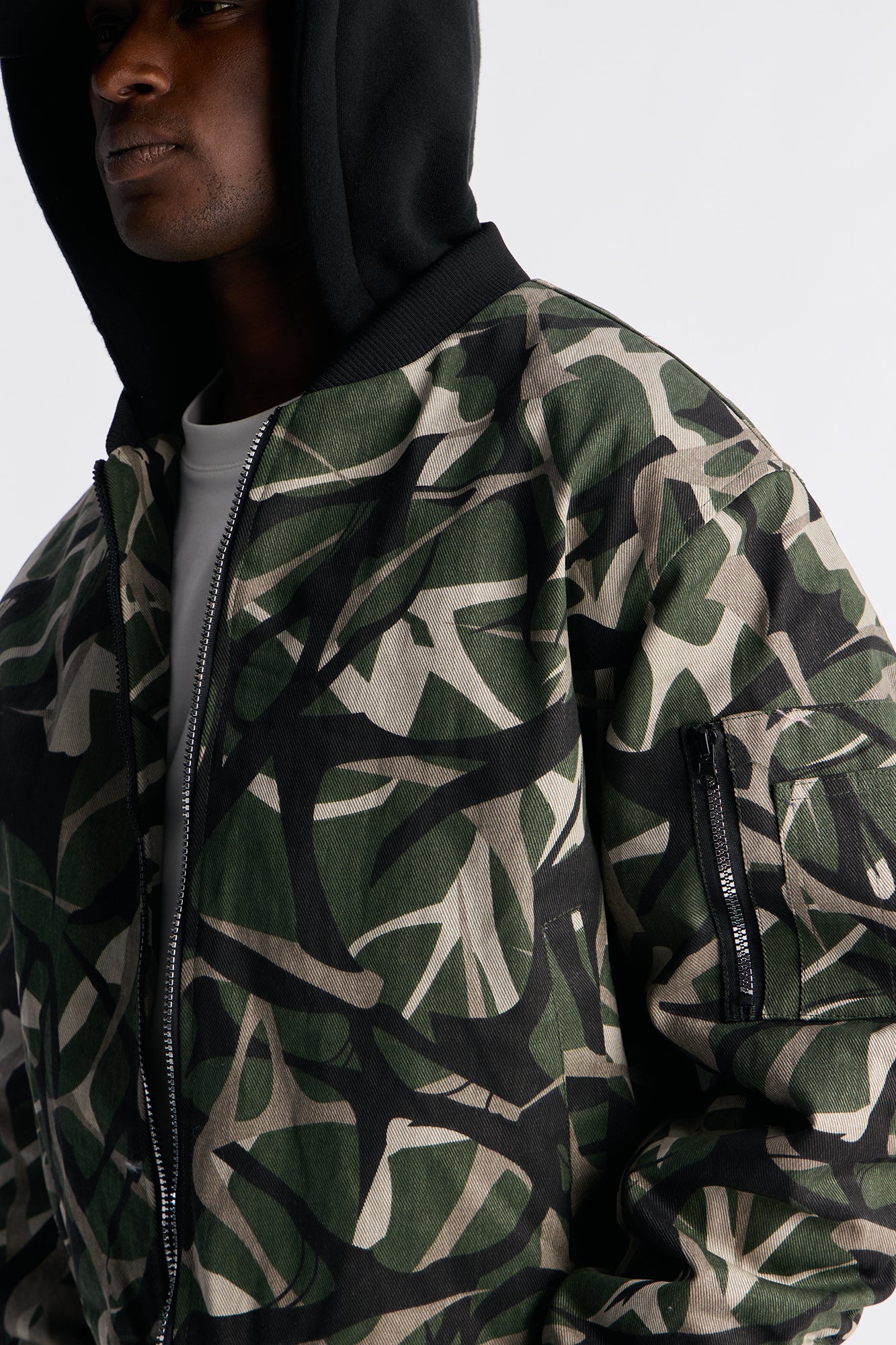 Hooded Edge Abstract Camo Bomber Jacket in Camouflage Pattern