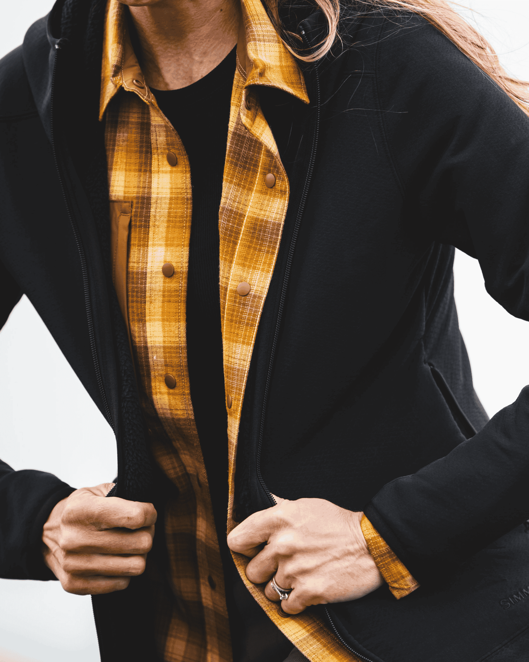 Experience ultimate comfort and versatility with the Womens Black Stormfleece Pro Midlayer Hoodie. The Stormfleece Pro with warm lofted fleece interior and C0 DWR finish offers wind and rain resistance. Stay agile with 4-way stretch fabric and maintain peripheral vision with the form-fitting hood. With YKK zippers and low-profile cuffs, this hoodie is perfect for layering under outerwear. Elevate your outdoor experience with this premium black hoodie.